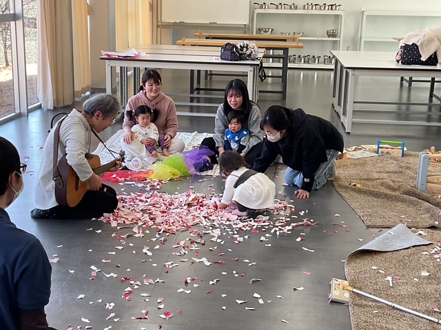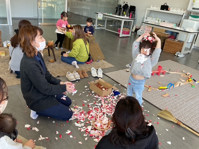おこさんはのおもちゃで遊んだり、梅の花に見立てた紙をフワ〜っと飛ばし花吹雪にしてみたり