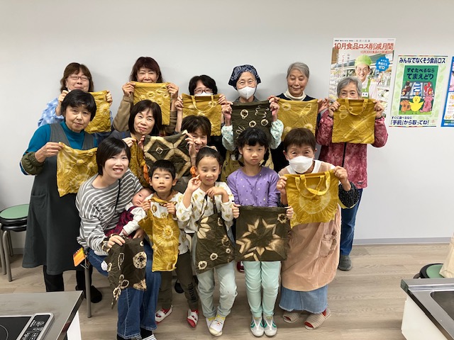 セイダカアワダチソウを煮出して、徐々に深みのある自然の色合いに変化していく様子がきれいでした。みんなそれぞれ違うデザインで少しずつ違う自然の色に染めたオリジナルのエコバックが出来上がり、とても楽しい時間となりました🎵